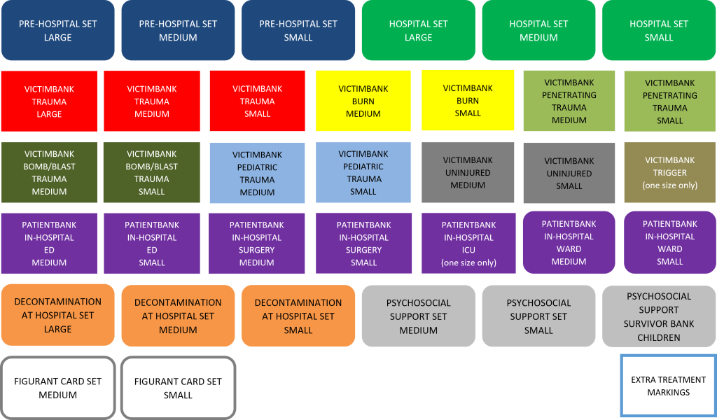 The Emergo Train System® (ETS) consists of magnetic symbols that are placed on whiteboards to illustrate for example a disaster scene or assembly point of a hospital. The core of ETS is a victim bank with injured patients divided into categories depending on the type of the injuries. The ETS Instructor in an exercise can choose suitable patients for a particular scenario. Maps, different frames and models, and pictures are also included in the material to help construct the simulation.